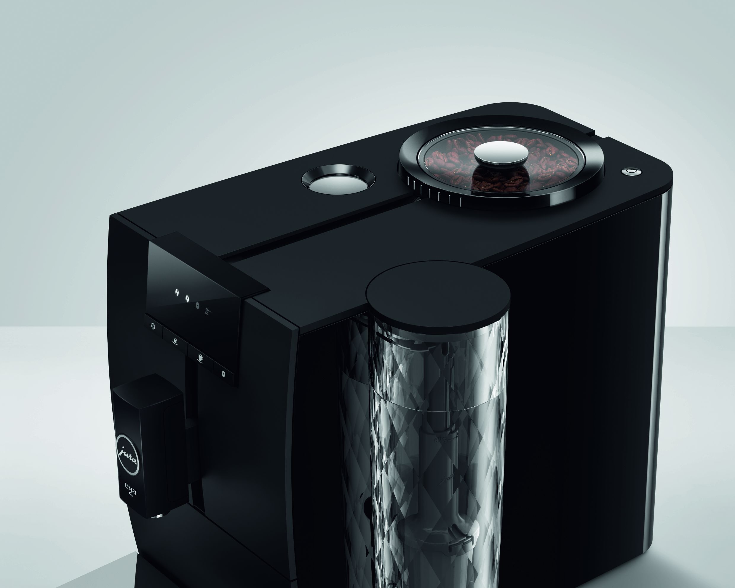 JURA ENA 4 je široká pouze 27,1 cm, vysoká 32,3 cm a hluboká 44,5 cm. Snadno ji kdekoli umístíte. Zároveň se jedná o kávovar s čistým designem. Vyznačuje se jednoduchou elegancí a válcovitou nádržkou na vodu s diamantovým vzhledem.