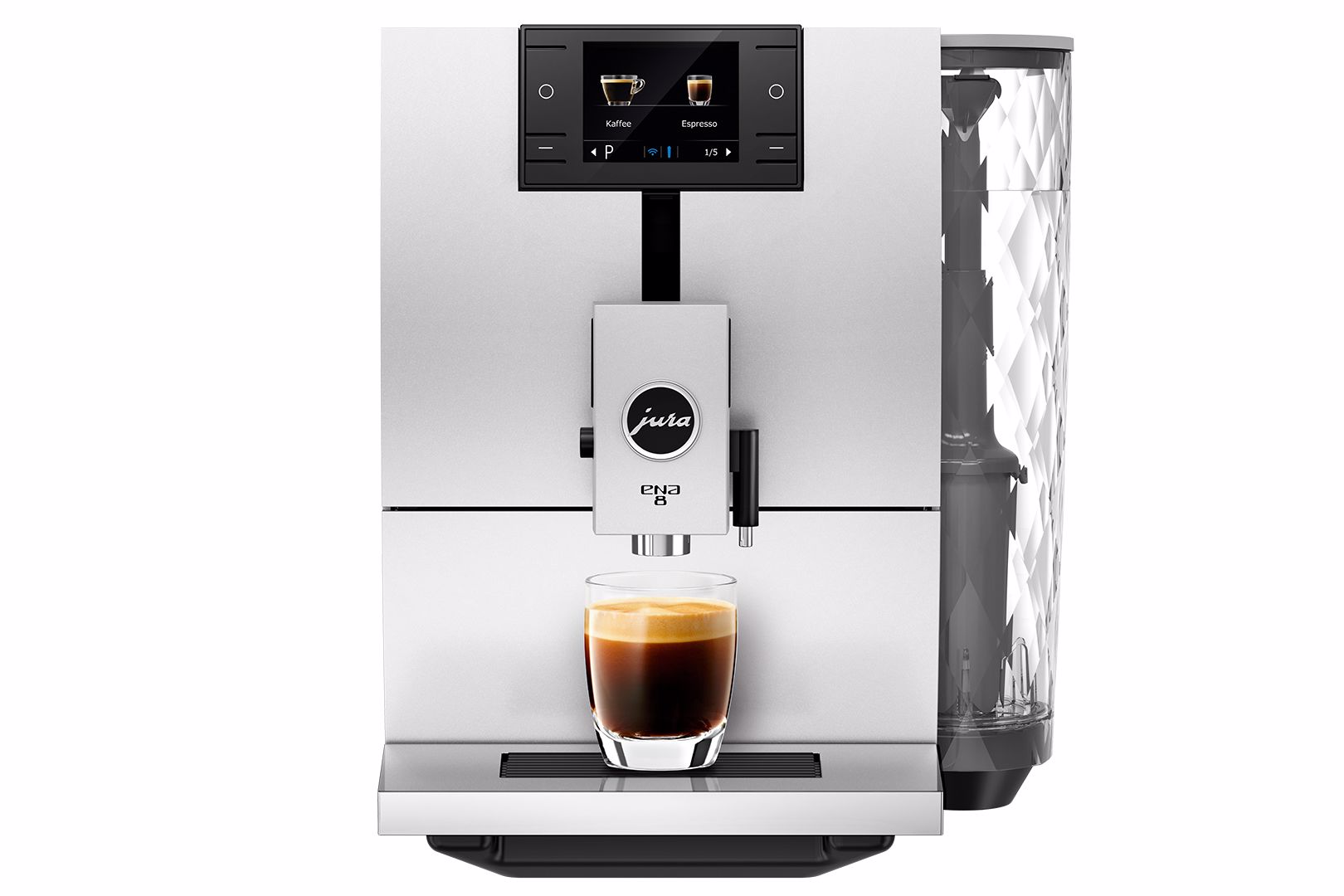 Působivým akcentem zaobleného designového provedení je kulatá nádržka na vodu. Její struktura, ve spojení s válcovým tvarem, je inspirována ušlechtilými křišťálovými karafami.